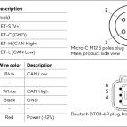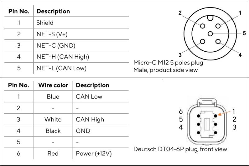 La presa standard NMEA 2000 M12 consente un'installazione plug-and-play alla dorsale di rete. Per interfacciare la connessione CAN J1939 è fornito un connettore Deutsch DT04-OP o-pole.