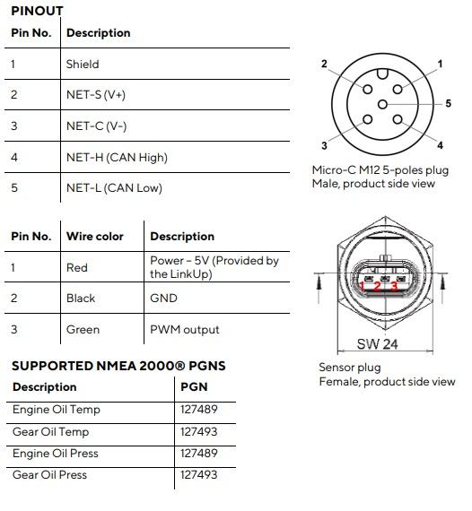 I moduli gateway LinkUp di facile installazione sostituiscono il cablaggio originale, fornendo alimentazione sia al dispositivo LinkUp che al sensore dalla dorsale NMEA 2000, pur rimanendo conformi alla certificazione NMEA 2000. Grazie al loro ricevitore wireless passivo, la configurazione viene eseguita in un attimo utilizzando il dispositivo mobile e l'app LinkUp Configurator disponibile per dispositivi Android e iOS. I parametri del sensore vengono configurati in base a tipo, istanza e soglia di avviso sul dispositivo mobile e quindi toccati sul dispositivo LinkUp per il download immediato dei dati. Prima di descrivere le diverse versioni di LinkUp, vorremmo sottolineare il fatto che questo dispositivo fa risparmiare denaro rispetto a un convertitore NMEA 2000 sovradimensionato. Riduce il cablaggio, poiché il dispositivo completo, costituito da 3 parti: un pigtail di 30 cm con un connettore M12 standard a 5 pin, il dispositivo LinkUp stesso contenente l'elettronica del dispositivo, il LED di notifica, l'interfaccia wireless per programmare il dispositivo e il cablaggio laterale NMEA 2000, che è l'uscita di tutte le varianti di LinkUp e infine un cavo lato sensore, compresi i cavi, lungo circa 50 cm quando srotolato. Gli altri vantaggi di questa apparecchiatura sono la configurazione senza contatto con il tuo smartphone, nessuna necessità di spendere soldi in un costoso HW, l'installazione dove necessario e nessuna alimentazione aggiuntiva necessaria poiché LinkUp è alimentato da NMEA. Ultimo ma non meno importante, grazie al suo alloggiamento sigillato, il dispositivo può essere installato nel vano motore secondo ISO 8846:1990 (protezione contro l'accensione di gas infiammabili circostanti). Come tutti i nostri prodotti, LinkUp è conforme a CE, Reach e RoHS. Questi potenti dispositivi sono veloci, senza alimentazione, sicuri, protetti e convenienti.