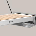 • Passerella telescopica rientrante a due stadi con funzionamento elettrico • Voltaggio 12/24 • Sistema pre-cablato con n. 3 motori elettrici • Gestione soft start su tutti e tre i movimenti • Rallentamento e controllo in PWM durante la fase di ricerca della posizione orizzontale di centraggio per una migliore precisione nella fase di rientro ed uscita • Struttura in acciaio inox verniciato o lucidato a specchio • Pedana di camminamento: - in teak con inserti antiscivolo - in materiale sintetico PVC stabilizzato ai raggi UV 100% ecologico • Disponibile versione PE 661.C con carrello per il superamento del gradino • Lunghezza standard cavi elettrici da fondo Box L = 1.5 MT • Box di alloggiamento in alluminio anodizzato con movimentazione automatica del portello. Box non a tenuta stagna • Staffe per il montaggio incluse • Candelieri automatici in acciaio lucido con corda su un lato • Funzionamento con telecomando ad onde radio e pannello di controllo per il comando dal pozzetto • Predisposizione per movimentazione tramite smartphone scaricando la APP Besenzoni Control Device ed installando l'unità di controllo BUC White • Misure ingombro della centralina elettronica 280x170xH = 100 mm. con antenna radio integrata nel sistema (compatibile con telecomando radio 6CS99047) • Optional : luci di cortesia a led sulla pedana finale fissa e sotto il musetto frontale ( da richiedere in fase di ordine e non applicabile a posteriori) • Strutturata per il passaggio di una persona alla volta |