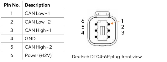 La presa standard NMEA 2000 M12 consente un'installazione plug-and-play alla dorsale di rete. Per interfacciare la connessione CAN J1939 è fornito un connettore Deutsch DT04-OP o-pole.