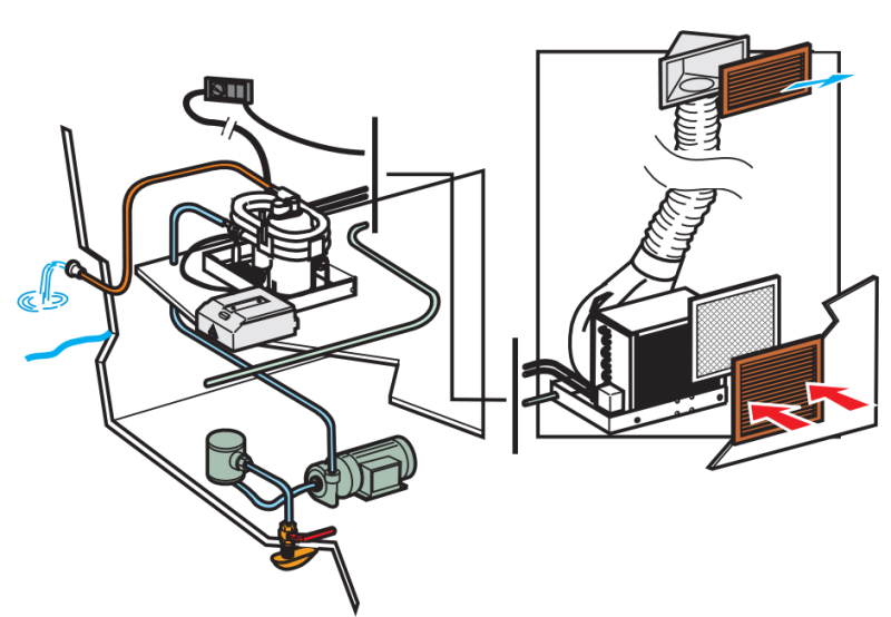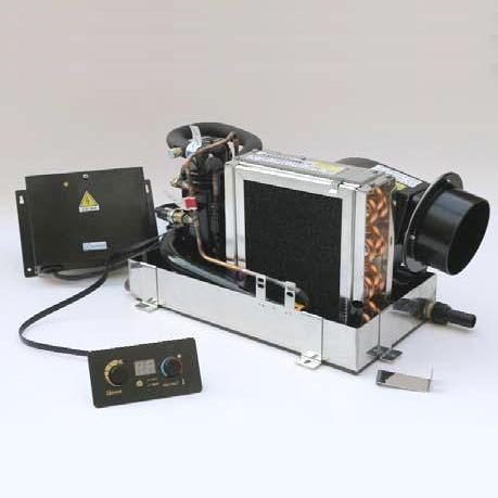 Modello di condizionatore estremamente compatto e adatto a condizionare una piccola cabina, in versione RC con ciclo estivo ed invernale ottenuto con inversione di ciclo. Compressore rotativo ad alta efficienza e con bassa corrente di spunto e di funzionamento adatto ad essere alimentato con un piccolo inverter con potenza minima di 500 W. Ventilatore silenzioso e potente con uscita dell'aria orientabile da orizzontale a verticale. Base e struttura in acciaio inossidabile per assicurare durata e resistenza nel difficile ambiente marino. Bacinella della condensa con raccordi ad angolo e dritti. Pannello di controllo remoto in versione digitale MK3. Disponibile una serie di pompe acqua mare di differente capacità adeguate al modello installato. Disponibile inoltre una scatola relay per collegare diverse unità alla stessa pompa. Ampia gamma di condotte flessibili e di accessori per la distribuzione dell'aria per una istallazione flessibile e pratica. Grande scelta di griglie in legno, alluminio e plastica per il migliore risultato estetico con qualsiasi stile di interni.