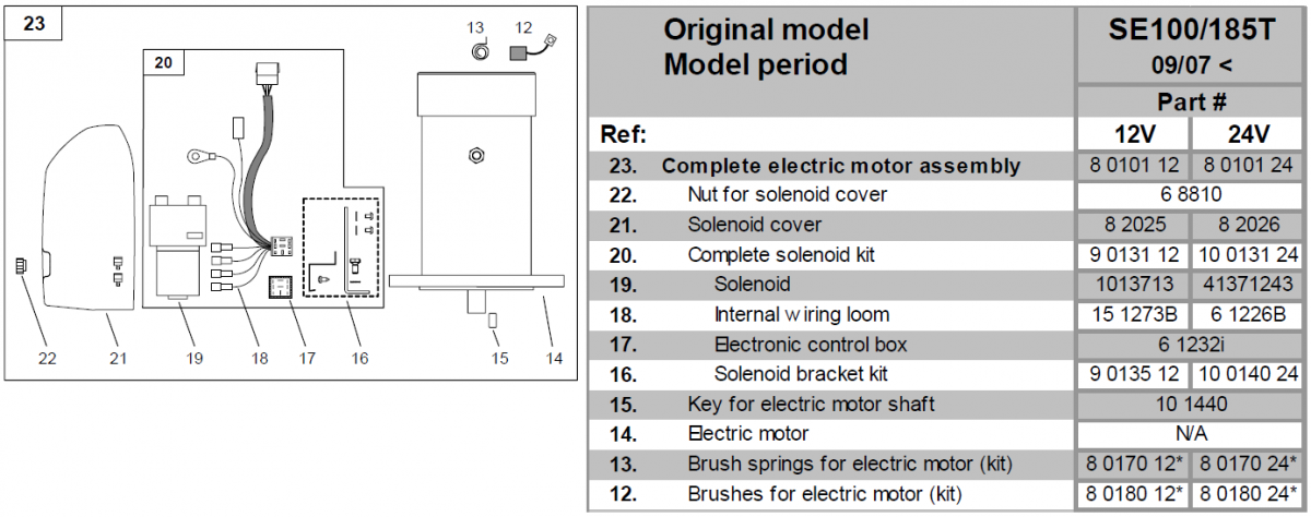 8 0101 12 Electric motor compl. SE 100/185T 12V SP95Ti 12V, SP95T 12V 8 0101 24 Electric motor compl. SE 100/185T 24V SP95Ti 24V, SP95T 24V |